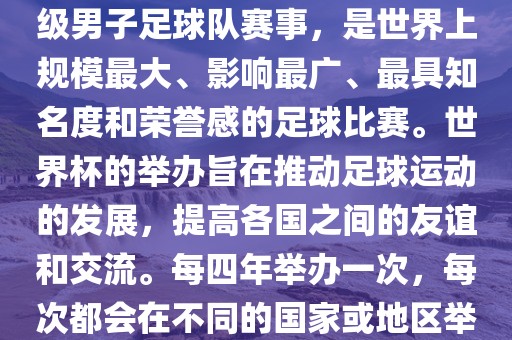 世界杯是由国际足球联合会主办的一项国家级男子足球队赛事,是世界上规模最大、影响最广的足球比赛。旨在推动足球运动的发展,增进各国之间的友谊和交流,每四年举办一次。世界杯历史悠久,自1930年举办以来,已经成功举办了二十几届,对于足球爱好者来说具有极高的荣誉感和知名度。