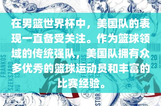 值得注意的是,美国队在男篮世界杯中的表现和成绩不仅取决于球队的整体实力和状态,还受到诸多因素的影响,如对手实力、比赛环境、球员伤病等,无法简单地预测美国队在男篮世界杯中的表现。