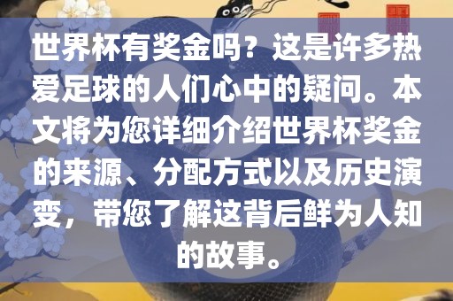世界杯有奖金吗?这是许多热爱足球的人们心中的疑问。本文将为您详细介绍世界杯奖金的来源、分配方式以及历史演变,带您了解这背后鲜为人知的故事。