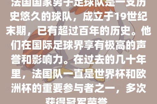 法国国家男子足球队是一支历史悠久的球队,成立于19世纪末期,已有超过百年的历史。他们在国际足球界享有极高的声誉和影响力。在过去的几十年里,法国队一直是世界杯和欧洲杯的重要参与者之一,多次获得冠军荣誉。