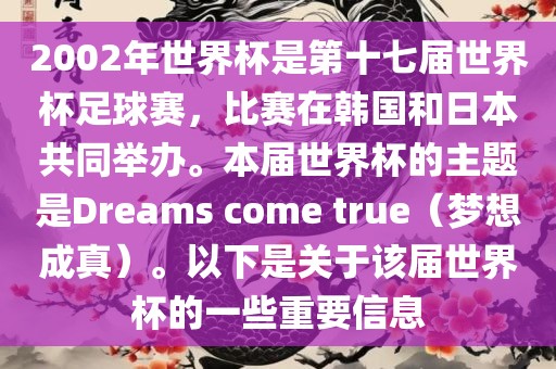 摘要:2002年世界杯足球赛是第十七届比赛,在韩国和日本共同举办,主题为Dreams come true。该届世界杯见证了众多精彩比赛和难忘的瞬间,同时也留下了许多重要信息,成为世界杯历史上的一个重要篇章。