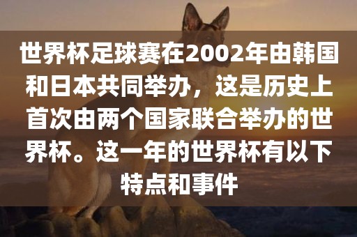 世界杯足球赛在2002年由韩国和日本共同举办,这是历史上首次由两个国家联合举办的世界杯。这一年的世界杯有以下特点和事件