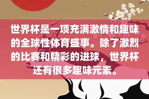 世界杯是一项充满激情和趣味的全球性体育盛事。除了激烈的比赛和精彩的进球,世界杯还有很多趣味元素。
