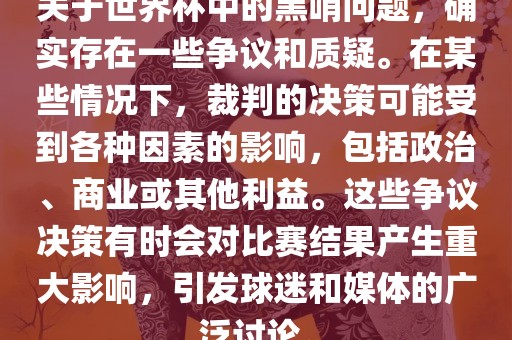 关于世界杯中的黑哨问题,确实存在一些争议和质疑。在某些情况下,裁判的决策可能受到各种因素的影响,包括政治、商业或其他利益。这些争议决策有时会对比赛结果产生重大影响,引发球迷和媒体的广泛讨论。