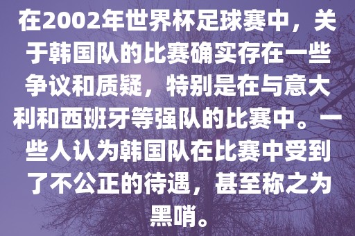 在2002年世界杯足球赛中,关于韩国队的比赛确实存在一些争议和质疑,特别是在与意大利和西班牙等强队的比赛中。一些人认为韩国队在比赛中受到了不公正的待遇,甚至称之为黑哨。