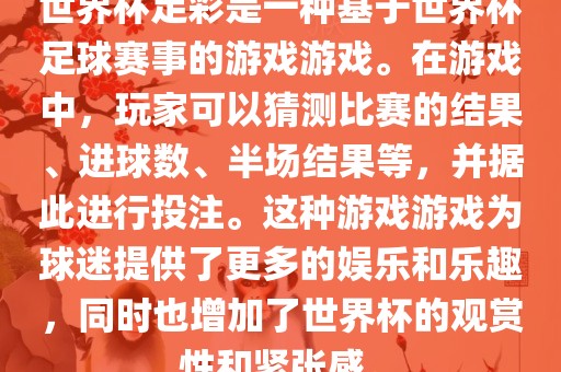 世界杯足彩是一种基于世界杯足球赛事的游戏游戏。在游戏中,玩家可以猜测比赛的结果、进球数、半场结果等,并据此进行投注。这种游戏游戏为球迷提供了更多的娱乐和乐趣,同时也增加了世界杯的观赏性和紧张感。