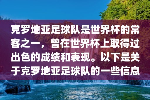 克罗地亚足球队是世界杯的常客之一,曾在世界杯上取得过出色的成绩和表现。以下是关于克罗地亚足球队的一些信息
