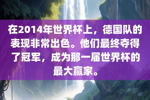 在2014年世界杯上,德国队的表现非常出色。他们最终夺得了冠军,成为那一届世界杯的最大赢家。