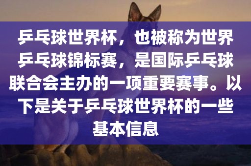 乒乓球世界杯,也被称为世界乒乓球锦标赛,是国际乒乓球联合会主办的一项重要赛事。以下是关于乒乓球世界杯的一些基本信息