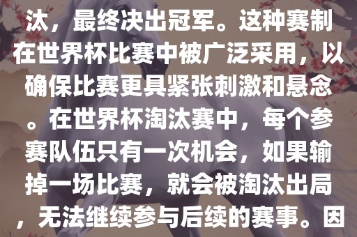 世界杯淘汰赛是一种紧张刺激的足球赛事赛制,要求参赛队伍具备出色的实力和战术安排,通过单败淘汰的方式,最终决出冠军,为球迷们带来精彩的足球盛宴。