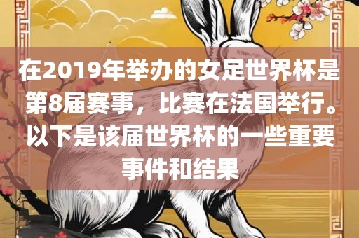 在2019年举办的女足世界杯是第8届赛事,比赛在法国举行。以下是该届世界杯的一些重要事件和结果
