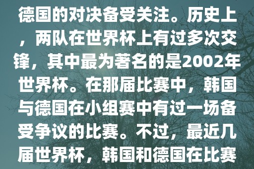 韩国与德国在世界杯足球比赛中的对决备受瞩目。历史上两队的交锋充满话题,尤其是2002年世界杯的小组赛。近年来两队在比赛中的表现趋于正常。尽管争议仍然存在,但足球比赛的结果取决于场上球员的表现和战术的运用。期待未来两队能展现出更加精彩的比赛。