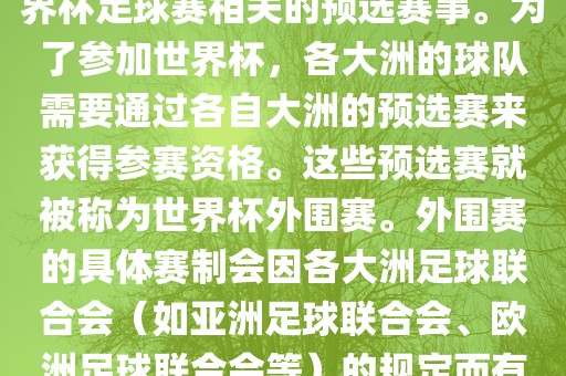 世界杯外围赛通常指的是与世界杯足球赛相关的预选赛事。为了参加世界杯,各大洲的球队需要通过各自大洲的预选赛来获得参赛资格。这些预选赛就被称为世界杯外围赛。外围赛的具体赛制会因各大洲足球联合会(如亚洲足球联合会、欧洲足球联合会等)的规定而有所不同。