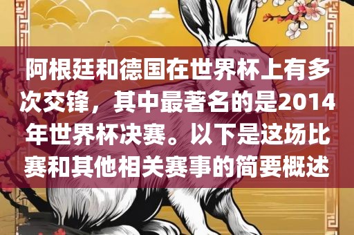 阿根廷和德国在世界杯上有多次交锋,其中最著名的是2014年世界杯决赛。以下是这场比赛和其他相关赛事的简要概述