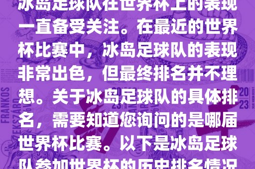 冰岛足球队在世界杯上的表现引人关注。尽管在最近的世界杯比赛中表现出色,但最终排名并不理想。关于其历史排名,需知道具体是哪届世界杯比赛。冰岛足球队在世界杯赛场上留下了深刻的足迹。