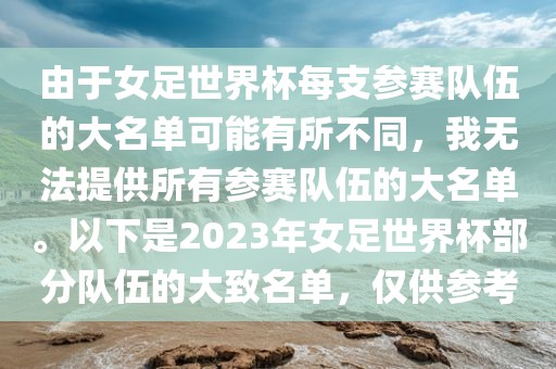 摘要:以下是2023年女足世界杯部分参赛队伍的大致名单。由于各队大名单可能有所不同,这里仅提供部分队伍的参考名单。具体名单可能会有所变动,请关注官方消息。