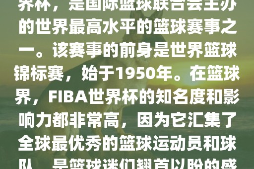 FIBA世界杯,也被称为篮球世界杯,是国际篮球联合会主办的世界最高水平的篮球赛事之一。该赛事的前身是世界篮球锦标赛,始于1950年。在篮球界,FIBA世界杯的知名度和影响力都非常高,因为它汇集了全球最优秀的篮球运动员和球队,是篮球迷们翘首以盼的盛事之一。