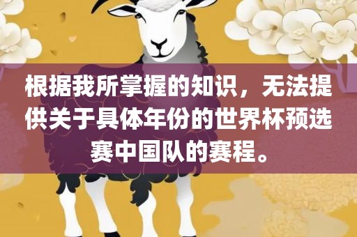 摘要:关于具体年份的世界杯预选赛中国队的赛程,由于信息有限,无法提供确切年份的赛程。需要关注相关体育新闻或官方渠道以获取最新信息。