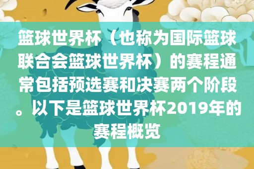 篮球世界杯(也称为国际篮球联合会篮球世界杯)的赛程通常包括预选赛和决赛两个阶段。以下是篮球世界杯2019年的赛程概览