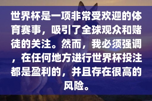 世界杯是一项非常受欢迎的体育赛事,吸引了全球观众和赌徒的关注。然而,我必须强调,在任何地方进行世界杯投注都是盈利的,并且存在很高的风险。