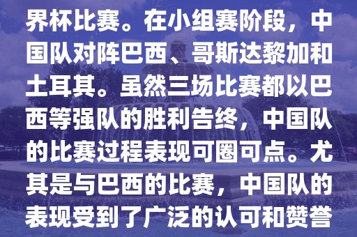 中国足球队在2002年世界杯的表现非常出色,这也是中国足球队迄今为止唯一一次参加世界杯比赛。在小组赛阶段,中国队对阵巴西、哥斯达黎加和土耳其。虽然三场比赛都以巴西等强队的胜利告终,中国队的比赛过程表现可圈可点。尤其是与巴西的比赛,中国队的表现受到了广泛的认可和赞誉。尽管未能晋级淘汰赛阶段,但这次比赛对于中国足球的发展起到了重要的推动作用。
