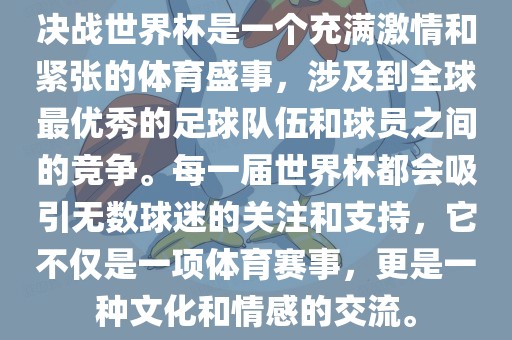 决战世界杯是一个充满激情和紧张的体育盛事,涉及到全球最优秀的足球队伍和球员之间的竞争。每一届世界杯都会吸引无数球迷的关注和支持,它不仅是一项体育赛事,更是一种文化和情感的交流。