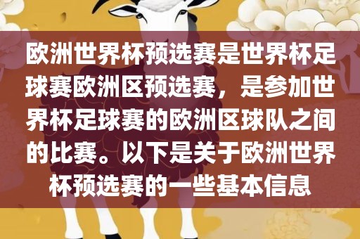欧洲世界杯预选赛是参加世界杯足球赛的欧洲区球队之间的比赛,对于参加世界杯的欧洲足球队来说具有重要意义,通过预选赛,各队可以锻炼实力、积累经验,为参加世界杯做好准备。