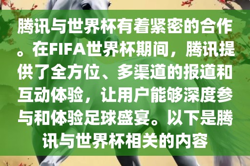腾讯与世界杯有着紧密的合作。在FIFA世界杯期间,腾讯提供了全方位、多渠道的报道和互动体验,让用户能够深度参与和体验足球盛宴。以下是腾讯与世界杯相关的内容