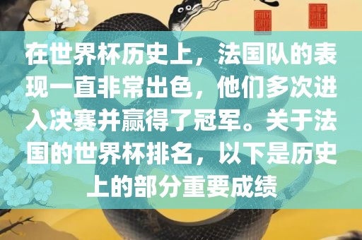 在世界杯历史上,法国队的表现一直非常出色,他们多次进入决赛并赢得了冠军。关于法国的世界杯排名,以下是历史上的部分重要成绩