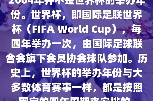 2004年并不是世界杯的举办年份。世界杯,即国际足联世界杯(FIFA World Cup),每四年举办一次,由国际足球联合会旗下会员协会球队参加。历史上,世界杯的举办年份与大多数体育赛事一样,都是按照固定的四年周期来安排的。