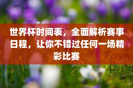 摘要:本文介绍了世界杯的时间表,全面解析了赛事日程,包括各场比赛的时间、地点和参赛队伍等信息。阅读本文,球迷们可以轻松了解世界杯赛事的安排,避免错过任何一场精彩比赛。文章简洁明了,让读者快速获取所需信息。