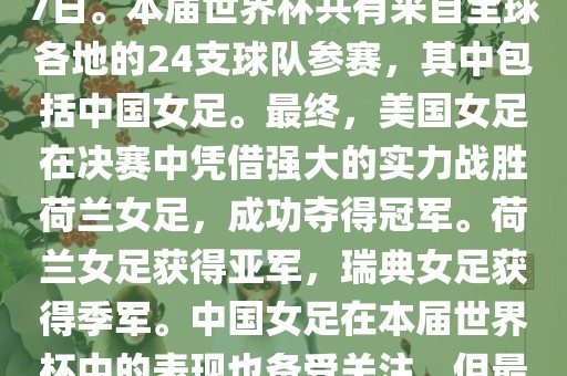 摘要:2019年女足世界杯在法国举行,是首次在欧洲举办的世界杯。比赛时间为一个月,共有来自全球各地的24支球队参赛,包括中国女足。美国女足夺冠,荷兰和瑞典分别获得亚军和季军。中国女足表现备受关注但未进八强。本届世界杯还创造了多项纪录和亮点。