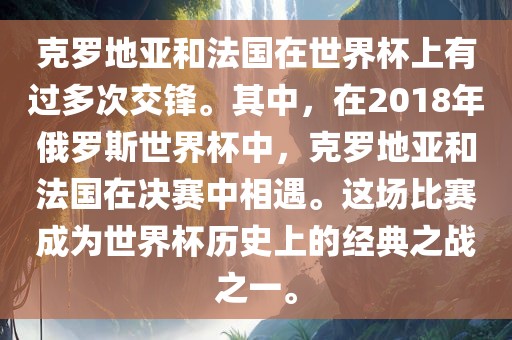 克罗地亚和法国在世界杯上有过多次交锋。其中,在2018年俄罗斯世界杯中,克罗地亚和法国在决赛中相遇。这场比赛成为世界杯历史上的经典之战之一。