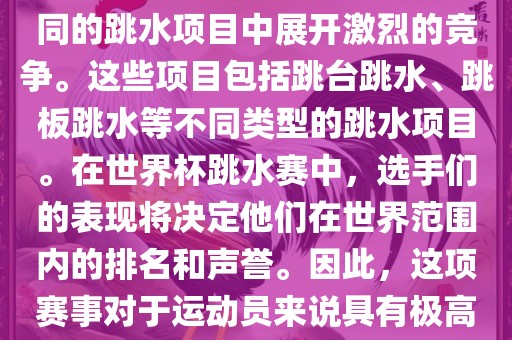 世界杯跳水赛是跳水运动的最高级别赛事之一,通常与世界跳水锦标赛等重大赛事交替举办。这项赛事汇集了全球最优秀的跳水运动员,他们将在不同的跳水项目中展开激烈的竞争。这些项目包括跳台跳水、跳板跳水等不同类型的跳水项目。在世界杯跳水赛中,选手们的表现将决定他们在世界范围内的排名和声誉。因此,这项赛事对于运动员来说具有极高的挑战性和重要性。同时,世界杯跳水赛也是展示各国跳水运动水平的重要舞台,对于推动全球跳水运动的发展起到了积极的作用。