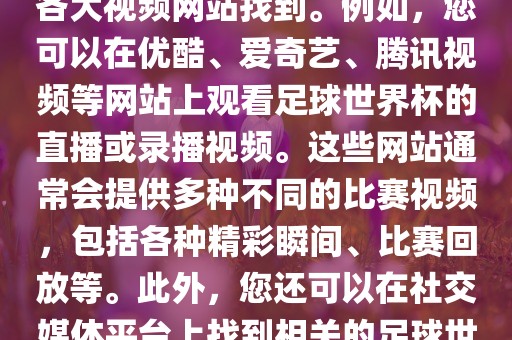 可以在各大视频网站观看足球世界杯的直播或录播视频,如优酷、爱奇艺、腾讯视频等。这些网站提供多种比赛视频,包括精彩瞬间和比赛回放等。社交媒体平台上也有相关视频分享。摘要字数控制在100-200字左右。
