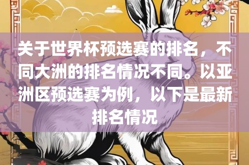 摘要:关于世界杯预选赛排名,各大洲情况各异。以亚洲区为例,最新的排名情况如下。随着比赛的进行,排名可能发生变化,请关注最新动态。