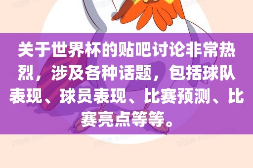 关于世界杯的贴吧讨论非常热烈,涉及各种话题,包括球队表现、球员表现、比赛预测、比赛亮点等等。
