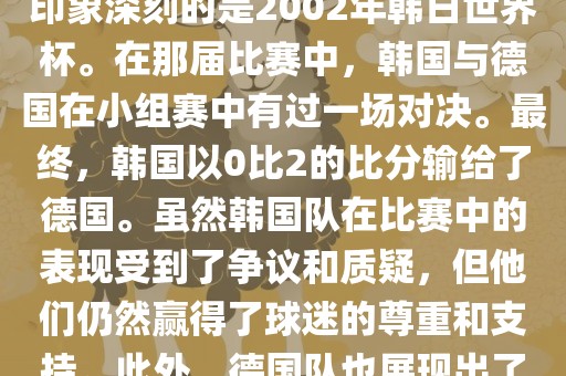 韩国和德国在世界杯足球赛中有过多次交锋。其中,最令人印象深刻的是2002年韩日世界杯。在那届比赛中,韩国与德国在小组赛中有过一场对决。最终,韩国以0比2的比分输给了德国。虽然韩国队在比赛中的表现受到了争议和质疑,但他们仍然赢得了球迷的尊重和支持。此外,德国队也展现出了强大的实力和战术素养,赢得了球迷们的赞赏。