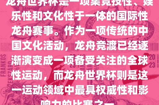 龙舟世界杯是一项集竞技性、娱乐性和文化性于一体的国际性龙舟赛事。作为一项传统的中国文化活动,龙舟竞渡已经逐渐演变成一项备受关注的全球性运动,而龙舟世界杯则是这一运动领域中最具权威性和影响力的比赛之一。