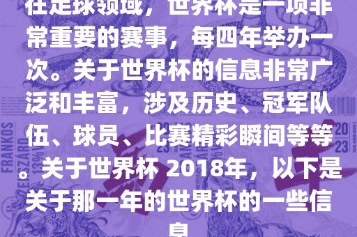 在足球领域,世界杯是一项非常重要的赛事,每四年举办一次。关于世界杯的信息非常广泛和丰富,涉及历史、冠军队伍、球员、比赛精彩瞬间等等。关于世界杯 2018年,以下是关于那一年的世界杯的一些信息
