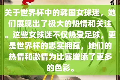 关于世界杯中的韩国女球迷,她们展现出了极大的热情和关注。这些女球迷不仅热爱足球,更是世界杯的忠实拥趸,她们的热情和激情为比赛增添了更多的色彩。